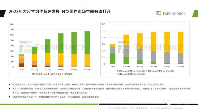 到2023年大尺寸組件產(chǎn)能預(yù)計575GW,市場占有率達(dá)89%,166及以下尺寸組件產(chǎn)品進(jìn)一步萎縮,隨著市場需求轉(zhuǎn)移,企業(yè)舊產(chǎn)能淘汰升級,166市占比僅為6.5%。大尺寸應(yīng)用場景多元化,地面電站的應(yīng)用主要以大尺寸為主,在分布式中企業(yè)也在推進(jìn)大尺寸的應(yīng)用,以適應(yīng)市場需求。N型組件因為享有先進(jìn)技術(shù)帶來的產(chǎn)品溢價,經(jīng)濟效益較好,企業(yè)有望加速推進(jìn)。