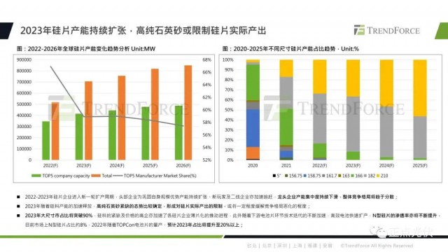 接下來是硅片的產(chǎn)能以及技術(shù)方向。2023年,硅片企業(yè)進(jìn)入了新一輪的擴產(chǎn)周期,頭部企業(yè)為了保護(hù)自身規(guī)模優(yōu)勢,產(chǎn)能在持續(xù)擴張。新玩家以及二線企業(yè)也在持續(xù)的擴張產(chǎn)能,龍頭企業(yè)的產(chǎn)能集中度在持續(xù)的下滑,整體行業(yè)的競爭格局趨于分散。在硅片生產(chǎn)環(huán)節(jié)中需要用到的坩鍋材料、高純石英砂緊缺的態(tài)勢也是比較確定的,這也將對硅片的實際產(chǎn)出形成限制。但這也在一定程度上緩解了硅片競爭格局的惡化。大尺寸及薄片化也是比較確定的,2023年大尺寸市占比將突破90%,硅料的緊缺以及價格高企加速了各硅片企業(yè)薄片化的推動進(jìn)程。此外,隨著下游電池片環(huán)節(jié)技術(shù)迭代的不斷加速,n型硅片的滲透率也將不斷提升,目前,n型硅片的總體產(chǎn)量還比較低,占比大約是在8%左右。隨著TOPCon電池片的量產(chǎn),預(yù)計2023年占比將提升至20%以上。