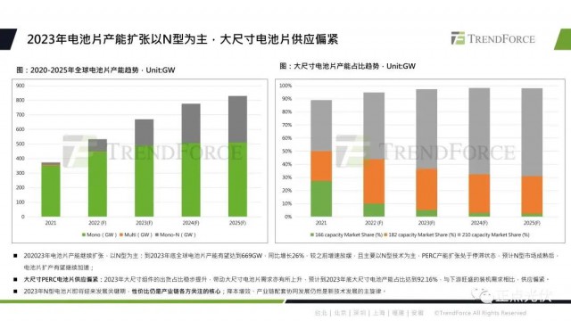 TOPCon因為它的性價比優(yōu)勢,實現(xiàn)了率先放量。預(yù)計到2023年底,N型電池片的產(chǎn)能將達(dá)到180GW,占比約為25.7%。
