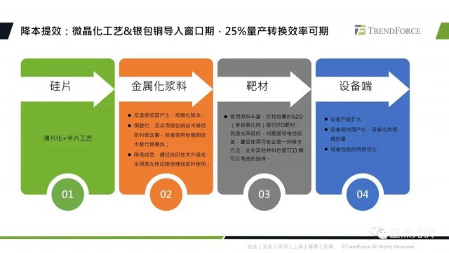 目前HJT技術(shù)降本增效的路徑還是比較確定的,硅片端主要是薄片化以及半片工藝的發(fā)展,金屬化漿料方面,包括低溫銀漿的國產(chǎn)化、規(guī)?;当?銀包銅、電鍍銅上降低銀漿的耗量,靶材價格以及用量的下降,還有設(shè)備國產(chǎn)化、規(guī)模化降本等方面。