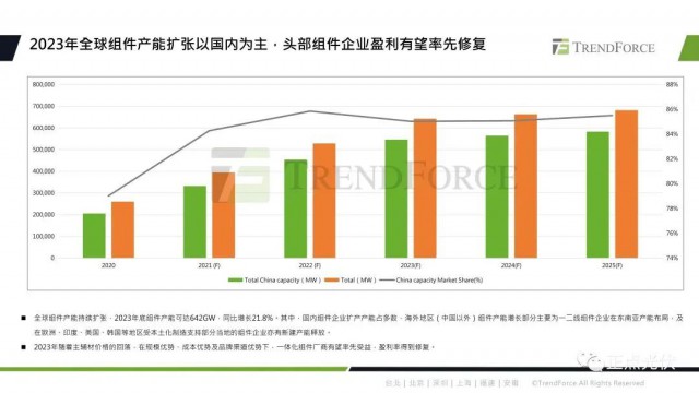 組件環(huán)節(jié)。全球組件產(chǎn)能也在持續(xù)的擴張,2023年底組件產(chǎn)能達(dá)642GW,同比增長了21.8%。其中國內(nèi)組件企業(yè)擴產(chǎn)產(chǎn)能占多數(shù),海外地區(qū)產(chǎn)能增長主要是國內(nèi)一、二線類企業(yè)在東南亞的產(chǎn)能布局。還有像歐洲、印度、美國、韓國等地受本土化支持,部分當(dāng)?shù)氐慕M件企業(yè)也有新建產(chǎn)能釋放。2023年,隨著在規(guī)模優(yōu)勢、成本優(yōu)勢以及品牌渠道優(yōu)勢,一體化組件廠商有望率先受益,盈利得到修復(fù)。