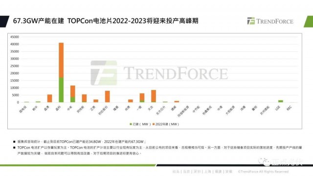 具體來看TOPCon技術(shù)的產(chǎn)能進(jìn)展與效率方面。據(jù)統(tǒng)計,截止到目前,TOPCon的已建產(chǎn)能大約是在34.8GW,2022年再建產(chǎn)能約為67.3GW。從目前公布的項目來看,規(guī)模還是十分可觀的。目前TOPCon電池的擴產(chǎn)還是以存量玩家為主,儲備項目前期投產(chǎn)的量產(chǎn)數(shù)據(jù)會比較關(guān)鍵,如果良率方面的問題可以得到有效的改善,后期項目的推進(jìn)將會更有信心。