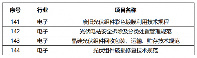 在公布的《2022年度工業(yè)節(jié)能與綠色標(biāo)準(zhǔn)研究項目清單》中,共包括鋼鐵、有色金屬、石化化工、建材、機械、汽車、輕工、紡織、電子、包裝、通信、船舶及綜合13個大類157項規(guī)范項目,其中在電子行業(yè),光伏電站的拆除、廢棄光伏組件的運輸、包裝、貯存及修復(fù)等技術(shù)規(guī)范被納入其中,分別為《廢舊光伏組件彩色鍍膜利用技術(shù)規(guī)程》、《光伏電站安全拆除及分類處置管理規(guī)范》、《晶硅光伏組件回收包裝、運輸、貯存技術(shù)規(guī)范》及《光伏組件破損修復(fù)技術(shù)規(guī)范》4項規(guī)范。