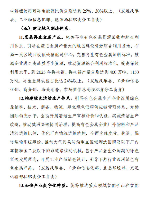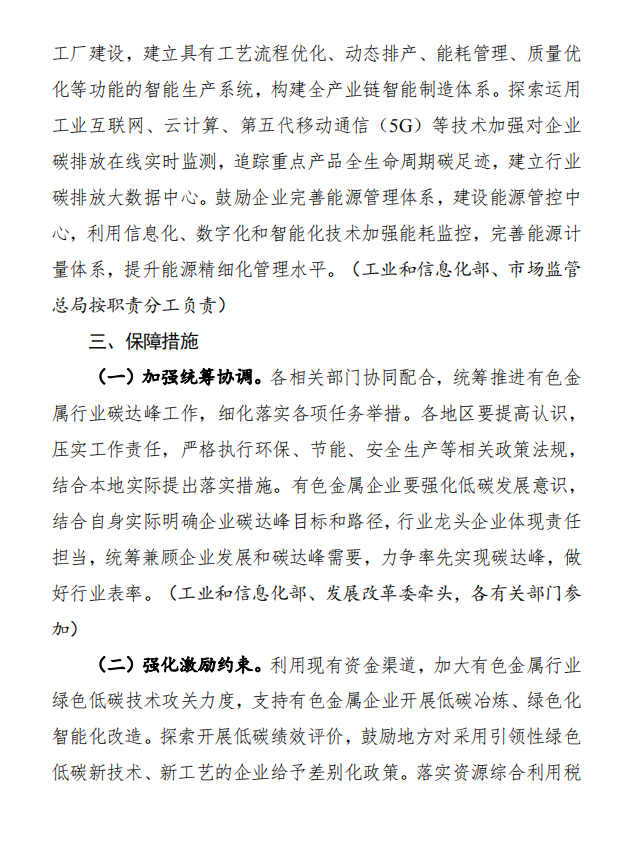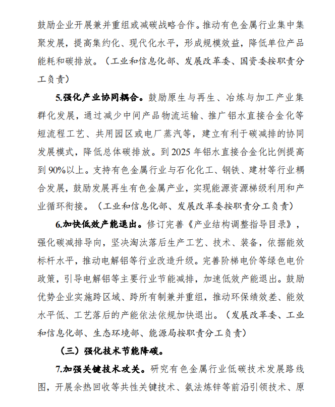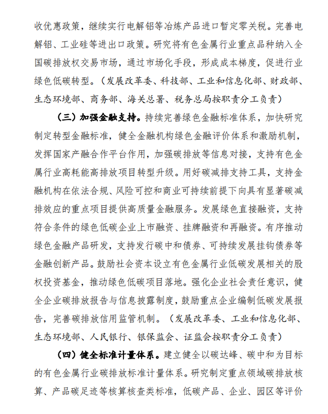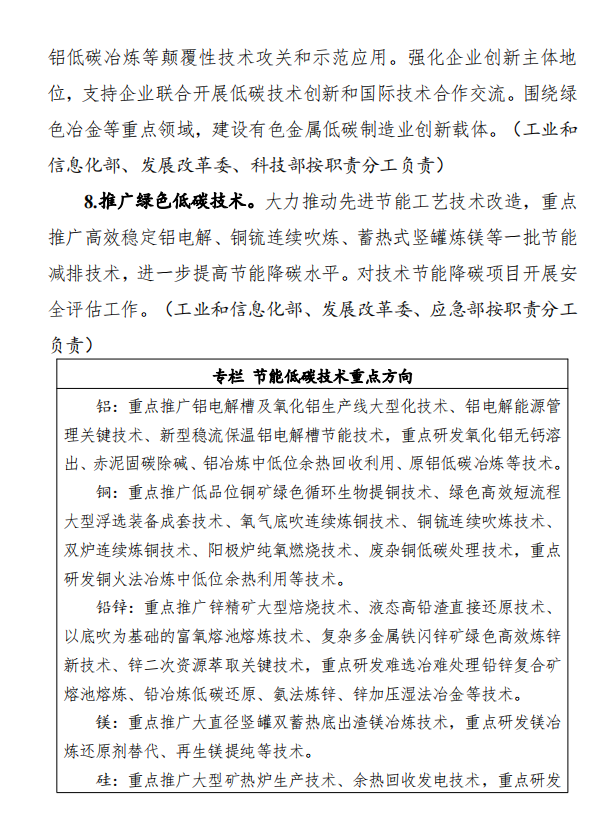 11月15日,工業(yè)和信息化部、國家發(fā)展和改革委員會和生態(tài)環(huán)境部發(fā)布《關(guān)于印發(fā)有色金屬行業(yè)碳達峰實施方案的通知》,(以下簡稱通知)通知指出,控制化石能源消費。推進有色金屬行業(yè)燃煤窯爐以電代煤,提升用能電氣化水平。在氣源有保障、氣價可承受的條件下有序推進以氣代煤。推動落后自備燃煤機組淘汰關(guān)?;虿捎们鍧嵢剂咸娲?。嚴禁在國家政策允許的領(lǐng)域以外新(擴)建燃煤自備電廠,推動電解鋁行業(yè)從使用自備電向網(wǎng)電轉(zhuǎn)化。支持企業(yè)參與光伏、風電等可再生能源和氫能、儲能系統(tǒng)開發(fā)建設(shè)。加強企業(yè)節(jié)能管理,嚴格落實國家強制性節(jié)能標準,持續(xù)開展工業(yè)節(jié)能監(jiān)察,規(guī)范企業(yè)用能行為。