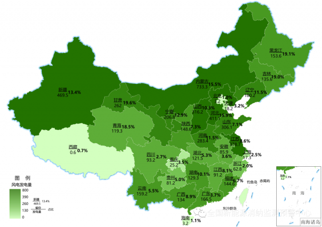 截至9月底累計風(fēng)電發(fā)電量(億千瓦時)及占本地區(qū)總發(fā)電量比重