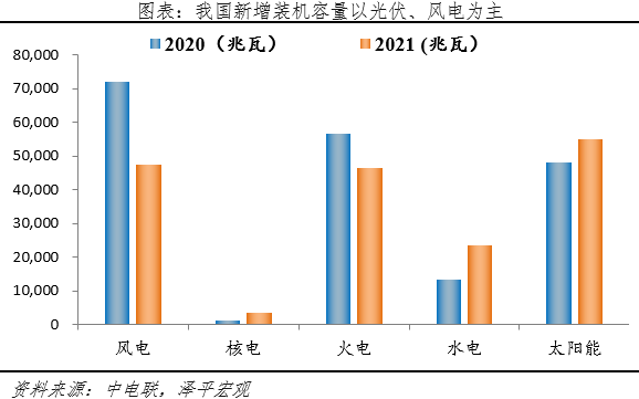新能源風(fēng)電、光伏發(fā)電量攀升,在社會(huì)用電量中占比高增。2021年,全國(guó)光伏發(fā)電量為3259億千瓦時(shí),同比增長(zhǎng)25.1%;全國(guó)風(fēng)電發(fā)電量為6526億千瓦時(shí),同比增長(zhǎng)40.5%。風(fēng)電、光伏累計(jì)發(fā)電量共9785億千瓦時(shí),同比增長(zhǎng)35.0%,占全社會(huì)用電量的比重達(dá)到11.7%,首次突破10%以上。