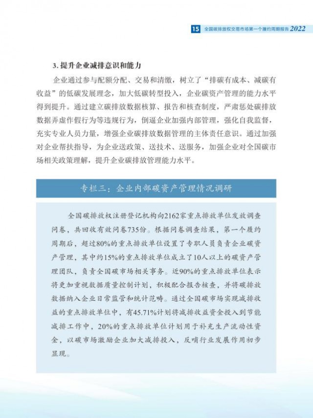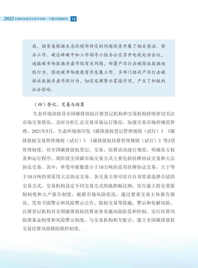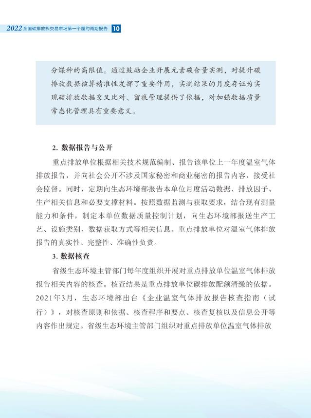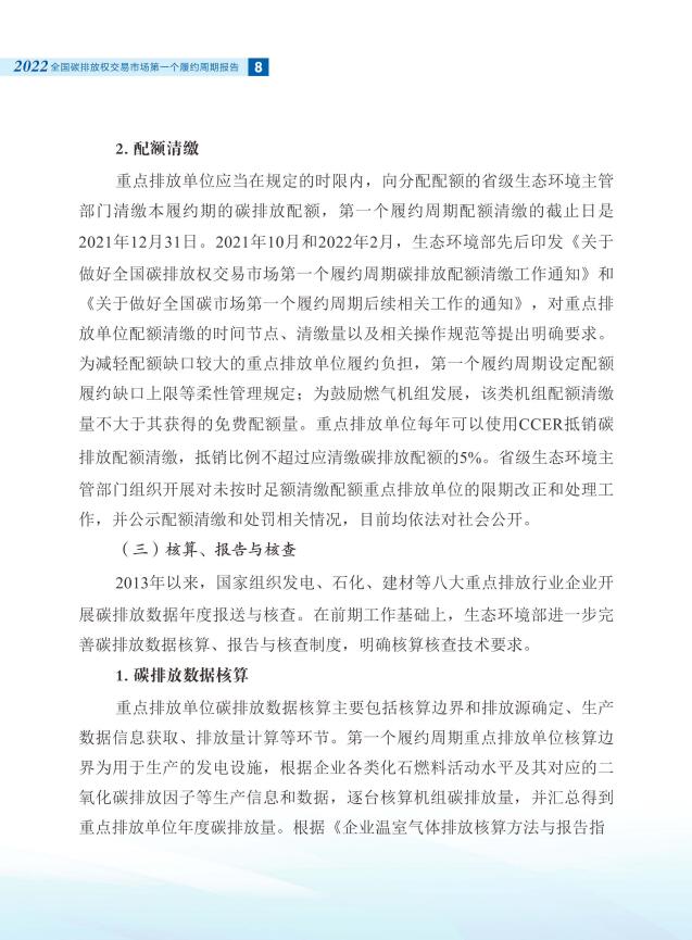 報告全面介紹了全國碳市場第一個履約周期市場交易和履約情況,對配額分配和清繳的工作考慮做了說明,總結(jié)梳理了碳排放核算、報告與核查制度體系建設(shè)進(jìn)展,對加強(qiáng)重點(diǎn)排放單位數(shù)據(jù)質(zhì)量管理相關(guān)舉措做了介紹。
