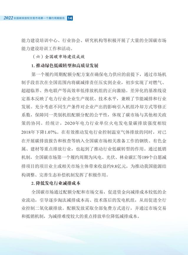 總體來看,經(jīng)過第一個履約周期建設(shè)運(yùn)行,全國碳市場運(yùn)行框架基本建立,初步打通了各關(guān)鍵環(huán)節(jié)間的堵點(diǎn)、難點(diǎn),價格發(fā)現(xiàn)機(jī)制作用初步顯現(xiàn),企業(yè)減排意識和能力水平得到有效提高,通過專項監(jiān)督幫扶等措施有效提升碳排放數(shù)據(jù)質(zhì)量,實(shí)現(xiàn)了預(yù)期建設(shè)目標(biāo)。全國碳市場建設(shè)運(yùn)行對促進(jìn)全社會低成本減排發(fā)揮了積極作用。