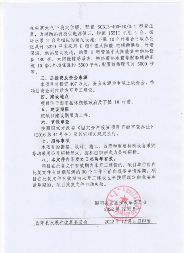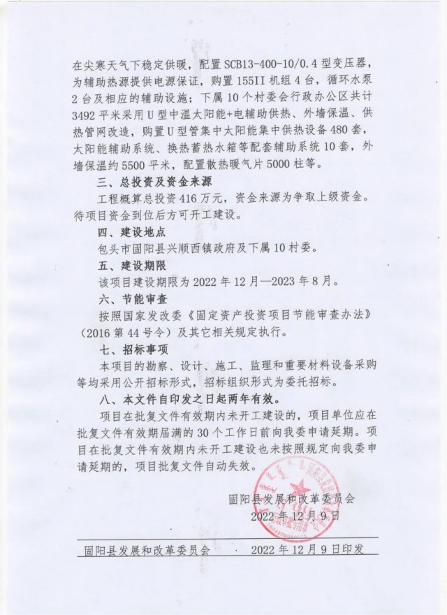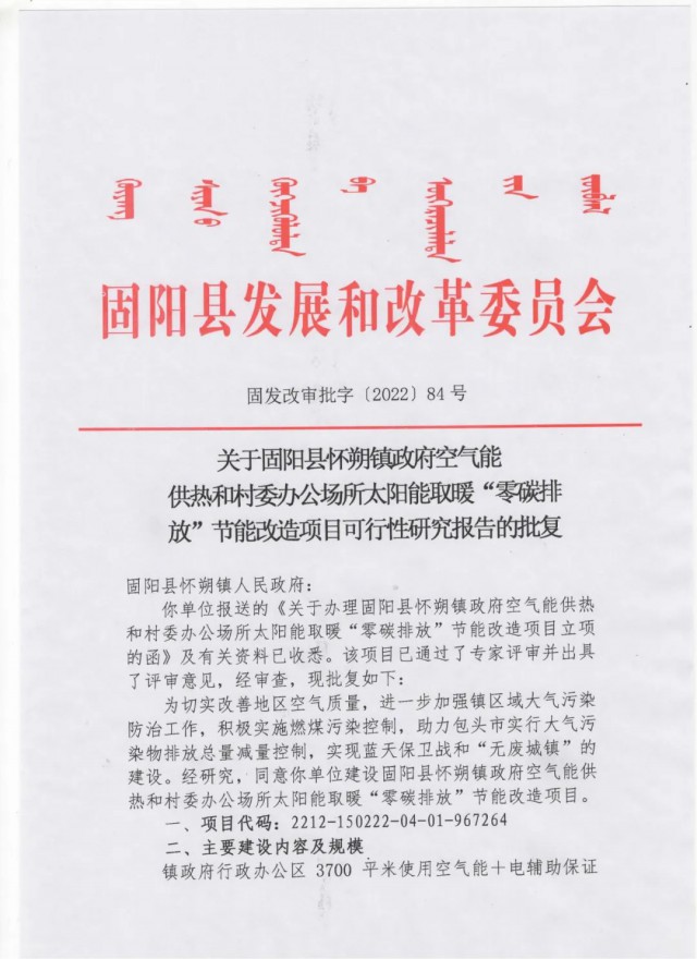 《固陽縣懷朔鎮(zhèn)政府空氣能供熱和村委辦公場所太陽能取暖"零碳排放”節(jié)能改造項(xiàng)目批復(fù)公示》