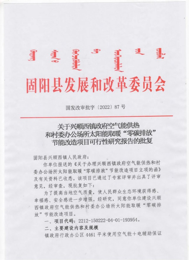 《固陽縣興順西鎮(zhèn)政府空氣能供熱和村委辦公場所太陽能取暖“零碳排放”節(jié)能改造項(xiàng)目批復(fù)公示》