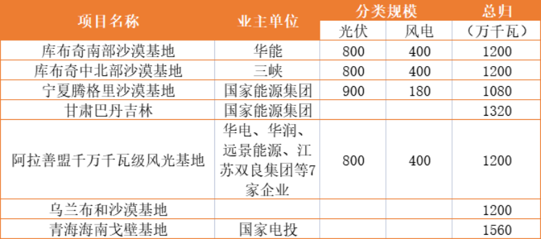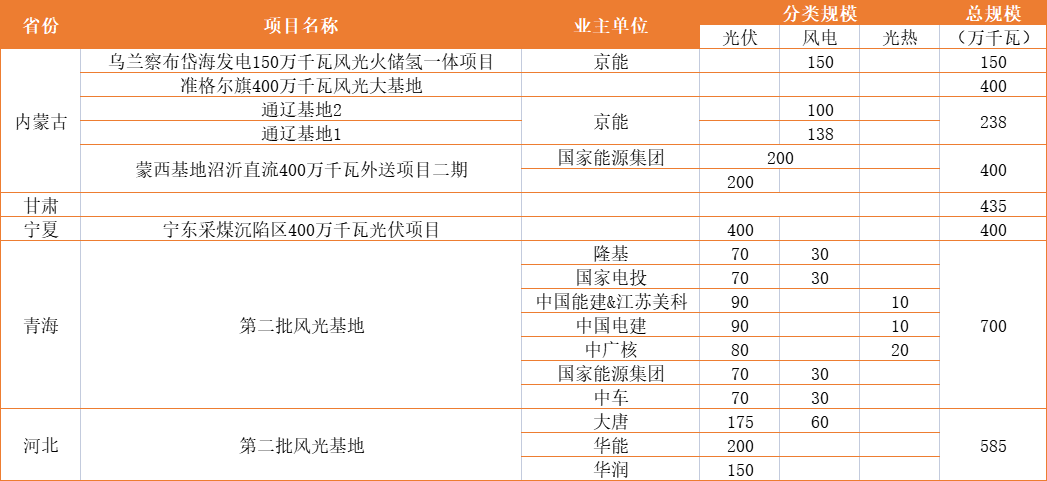 說(shuō)明:上述數(shù)據(jù)通過(guò)公開(kāi)信息整理,各企業(yè)數(shù)據(jù)存在未明確項(xiàng)目,具體以企業(yè)官方數(shù)據(jù)為準(zhǔn)。此外,大基地存在聯(lián)合體業(yè)主,本表數(shù)據(jù)以牽頭企業(yè)為主。