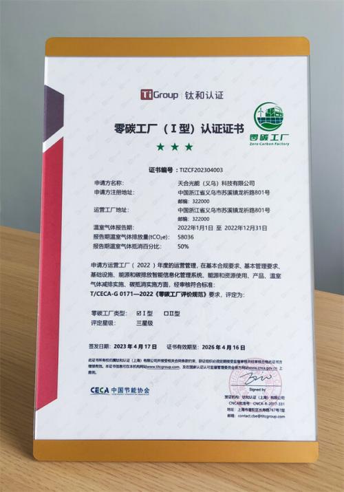 2023年4月11日~12日,零碳工廠授權(quán)評價(jià)機(jī)構(gòu)--鈦和認(rèn)證依據(jù)《零碳工廠評價(jià)規(guī)范》,從合規(guī)要求、管理要求、基礎(chǔ)設(shè)施、能源和碳排放智能信息化管理系統(tǒng)、能源和資源使用、產(chǎn)品生態(tài)設(shè)計(jì)、溫室氣體減排實(shí)施、碳抵消實(shí)施八項(xiàng)一級指標(biāo)對義烏基地進(jìn)行了詳細(xì)的評估和審核,義烏基地最終獲得了綜合評分79.68(該等級滿分為80分)的高分,自主減排后完成了對直接溫室氣體排放和輸入能源間接溫室氣體排放抵消50%,成功獲得了由鈦和認(rèn)證集團(tuán)頒發(fā)的2022年度的零碳工廠證書,成為太陽能行業(yè)首位獲第三方授權(quán)評價(jià)機(jī)構(gòu)認(rèn)證的零碳工廠企業(yè)。