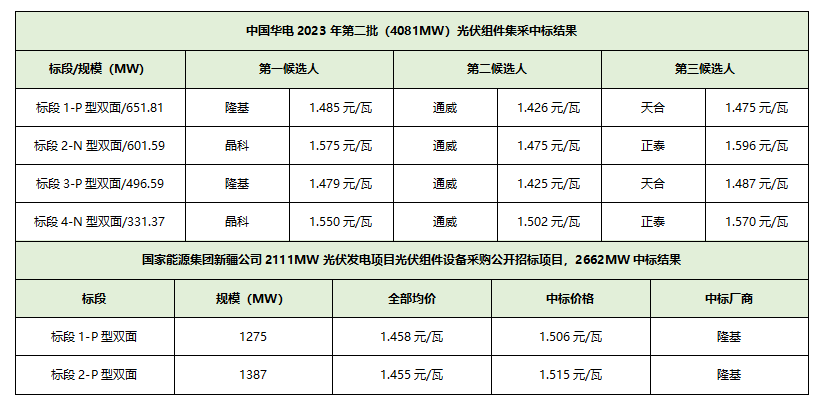 當(dāng)項目落地不再受制于組件價格,終端發(fā)電企業(yè)將更關(guān)注資產(chǎn)安全伴生的穩(wěn)定收益,“低價”已不是它們關(guān)注的主要判斷因素。近期中國華電2023年4081MW光伏組件集采、國家能源集團新疆公司2111MW光伏發(fā)電項目組件設(shè)備采購招標(biāo)結(jié)果印證了這種趨勢。