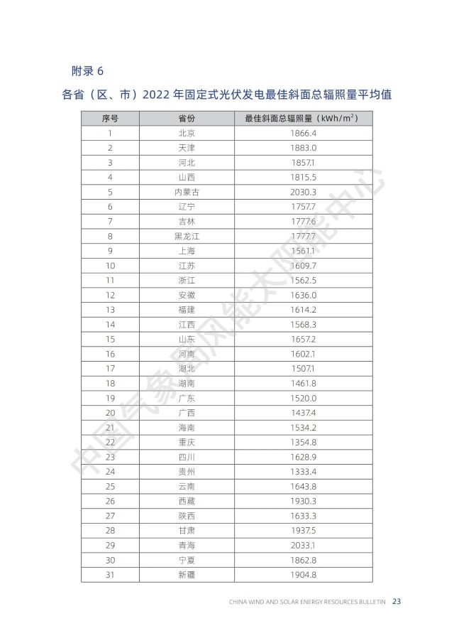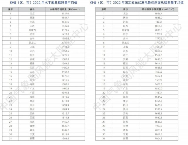 上圖為全國(guó)平均值,具體到各個(gè)省份的年水平面總輻射量、年傾斜面面總輻射量數(shù)值如下表所示。