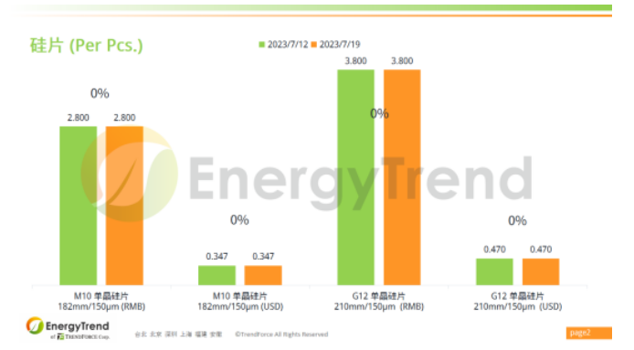 M10單晶硅片人民幣報價為 RMB2.8/Pc;美金最新報價為 US$0.347/Pc。G12單晶硅片人民幣報價保持在 RMB3.8/Pc;美金報價為 US$0.47/Pc。