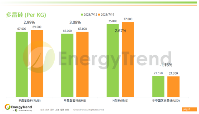 根據(jù)集邦咨詢旗下新能源研究中心集邦新能源網(wǎng)(EnergyTrend)2023年7月19日的報價,單晶復(fù)投料人民幣價格為 RMB69/KG,增幅為 2.99%;單晶致密料人民幣最新價格為 RMB67/KG,較上周增長了 3.08%。N型料人民幣報價從 RMB75/KG 增長至 RMB77/KG,漲幅為 2.67%。非中國區(qū)多晶硅料美金價格為 US$21.3/KG。