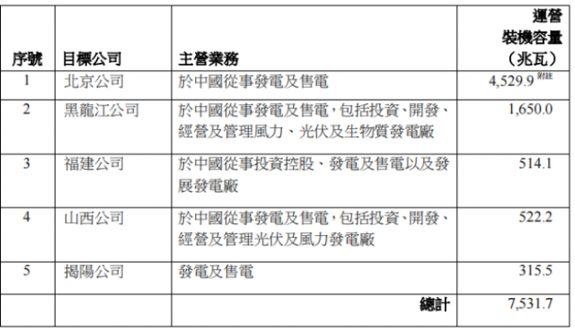 7月26日,中國電力發(fā)布《有關(guān)收購事項(xiàng)之主要及關(guān)連交易》,公告稱擬向控股股東國家電投收購清潔能源發(fā)電業(yè)務(wù),包括北京電力55.15%、黑龍江電力、福建電力、山西電力及揭陽前詹風(fēng)電各100%股權(quán),以加速打造公司作為國家電投清潔能源旗艦上市附屬。