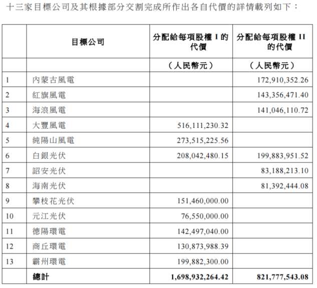 事實(shí)上,去年6月30日,中國電力便宣布計(jì)劃以現(xiàn)金及股權(quán)結(jié)合方式,收購母公司國家電投集團(tuán)旗下中電新能源及中電國際新能源的215.48萬千瓦可再生能源資產(chǎn)(主要以光伏、風(fēng)電為主,還有少量環(huán)保發(fā)電)。隨后9月26日中國電力就完成了2.16GW新能源項(xiàng)目收購首批資產(chǎn)交割。首批交割資產(chǎn)包括紅旗風(fēng)電、海南光伏、純陽山風(fēng)電、內(nèi)蒙古風(fēng)電、霸州環(huán)保、攀枝花光伏、白銀光伏等在內(nèi)的13家目標(biāo)公司。