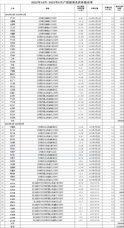 根據(jù)《關(guān)于戶用光伏發(fā)電項(xiàng)目補(bǔ)助有關(guān)事項(xiàng)的通知》(云發(fā)改辦〔2021〕79號(hào))文件精神,2022年10-2023年6月的戶用光伏項(xiàng)目業(yè)主向縣發(fā)改局申請(qǐng)了資金補(bǔ)助,縣發(fā)改局與電力部門進(jìn)行了核對(duì)后,確定了補(bǔ)助名單和金額?,F(xiàn)將補(bǔ)助名單和補(bǔ)助金額進(jìn)行公示,詳見附表。
