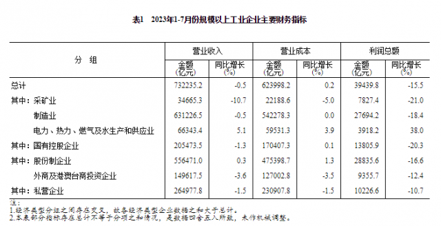 7月份,規(guī)模以上工業(yè)企業(yè)實(shí)現(xiàn)利潤(rùn)總額5561.0億元,同比下降6.7%。