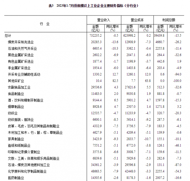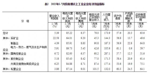1—7月份,規(guī)模以上工業(yè)企業(yè)實(shí)現(xiàn)營(yíng)業(yè)收入73.22萬億元,同比下降0.5%;發(fā)生營(yíng)業(yè)成本62.40萬億元,增長(zhǎng)0.2%;營(yíng)業(yè)收入利潤(rùn)率為5.39%,同比下降0.95個(gè)百分點(diǎn)。