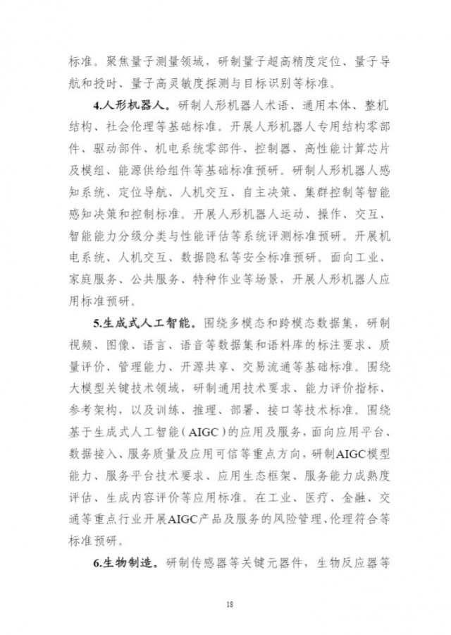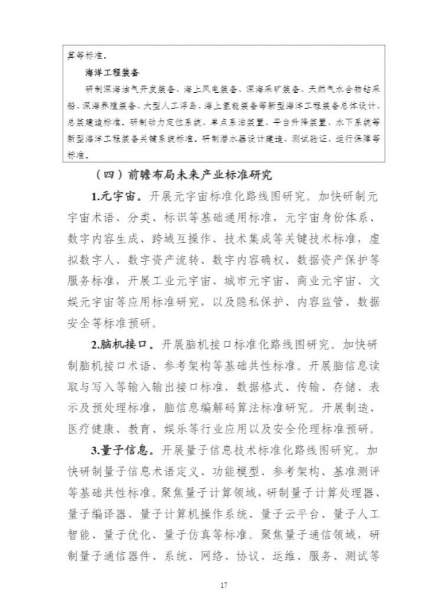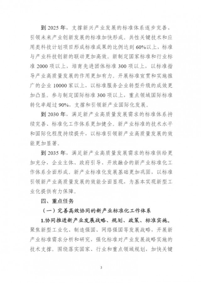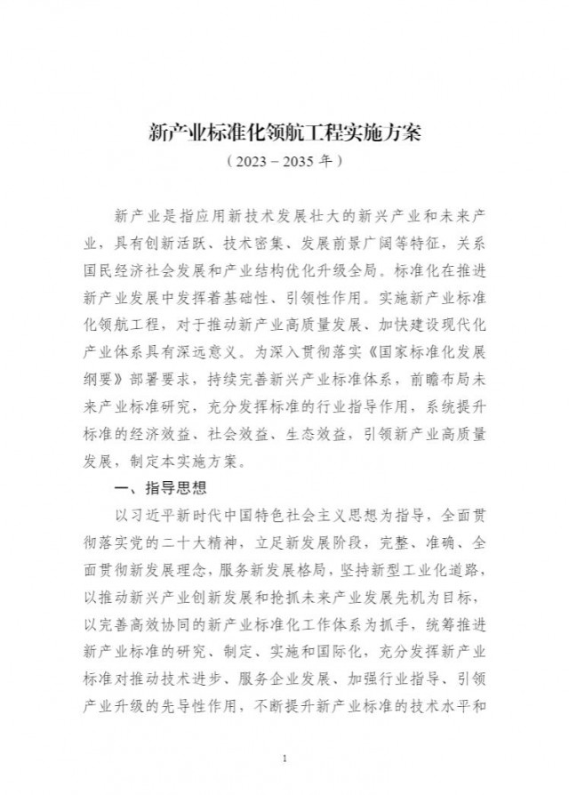 為貫徹落實(shí)《國(guó)家標(biāo)準(zhǔn)化發(fā)展綱要》,持續(xù)完善新興產(chǎn)業(yè)標(biāo)準(zhǔn)體系建設(shè),前瞻布局未來(lái)產(chǎn)業(yè)標(biāo)準(zhǔn)研究,充分發(fā)揮標(biāo)準(zhǔn)的行業(yè)指導(dǎo)作用,引領(lǐng)新產(chǎn)業(yè)高質(zhì)量發(fā)展,工業(yè)和信息化部、科技部、國(guó)家能源局、國(guó)家標(biāo)準(zhǔn)化管理委員會(huì)組織編制了《新產(chǎn)業(yè)標(biāo)準(zhǔn)化領(lǐng)航工程實(shí)施方案(2023─2035年)》?,F(xiàn)印發(fā)你們,請(qǐng)結(jié)合本地區(qū)、本行業(yè)實(shí)際,抓好貫徹落實(shí)。