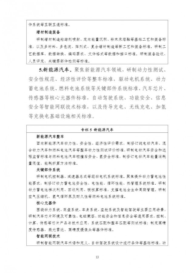 《方案》明確,在新能源汽車(chē)方面,聚焦新能源汽車(chē)領(lǐng)域,研制動(dòng)力性測(cè)試、安全性規(guī)范、經(jīng)濟(jì)性評(píng)價(jià)等整車(chē)標(biāo)準(zhǔn),驅(qū)動(dòng)電機(jī)系統(tǒng)、動(dòng)力蓄電池系統(tǒng)、燃料電池系統(tǒng)等關(guān)鍵部件系統(tǒng)標(biāo)準(zhǔn),汽車(chē)芯片、傳感器等核心元器件標(biāo)準(zhǔn),自動(dòng)駕駛系統(tǒng)、功能安全、信息安全等智能網(wǎng)聯(lián)技術(shù)標(biāo)準(zhǔn),以及傳導(dǎo)充電、無(wú)線充電、加氫等充換電基礎(chǔ)設(shè)施相關(guān)標(biāo)準(zhǔn)。