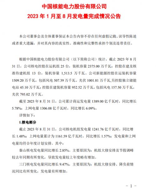 9月27日,中國核電發(fā)布公告表示,根據(jù)中國核能電力股份有限公司(以下簡稱公司)統(tǒng)計(jì),截止2023年8月31日,中國核電新能源控股在運(yùn)裝機(jī)容量1509.20萬千瓦,包括風(fēng)電507.39萬千瓦、光伏1001.81萬千瓦,另控股獨(dú)立儲能電站45.10萬千瓦;控股在建裝機(jī)容量952.52萬千瓦,包括風(fēng)電157.50萬千瓦,光伏795.02萬千瓦。截至2023年8月31日,公司累計(jì)商運(yùn)發(fā)電量1389.00億千瓦時(shí),同比增長5.78%;上網(wǎng)電量1306.08億千瓦時(shí),同比增長6.09%。
