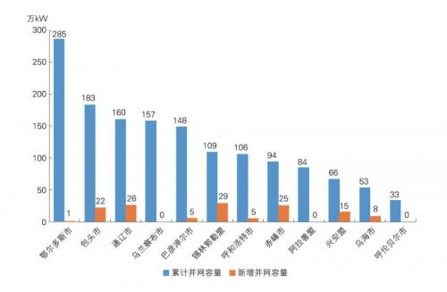 2022年,內(nèi)蒙古自治區(qū)太陽能發(fā)電新增并網(wǎng)裝機(jī)容量為156萬千瓦。截至2022年底,內(nèi)蒙古自治區(qū)太陽能發(fā)電累計并網(wǎng)裝機(jī)容量達(dá)到1558萬千瓦(不含10萬千瓦光熱項目),同比增長11.1%,太陽能發(fā)電累計并網(wǎng)裝機(jī)容量居全國第十二位,約占全部電源總裝機(jī)容量的9.2%。分盟(市)看,內(nèi)蒙古自治區(qū)太陽能發(fā)電裝機(jī)主要集中在鄂爾多斯市、包頭市、通遼市、烏蘭察布市、巴彥淖爾市、錫林郭勒盟、呼和浩特市等7個盟(市),2022年底累計并網(wǎng)裝機(jī)容量均超過100萬千瓦。
