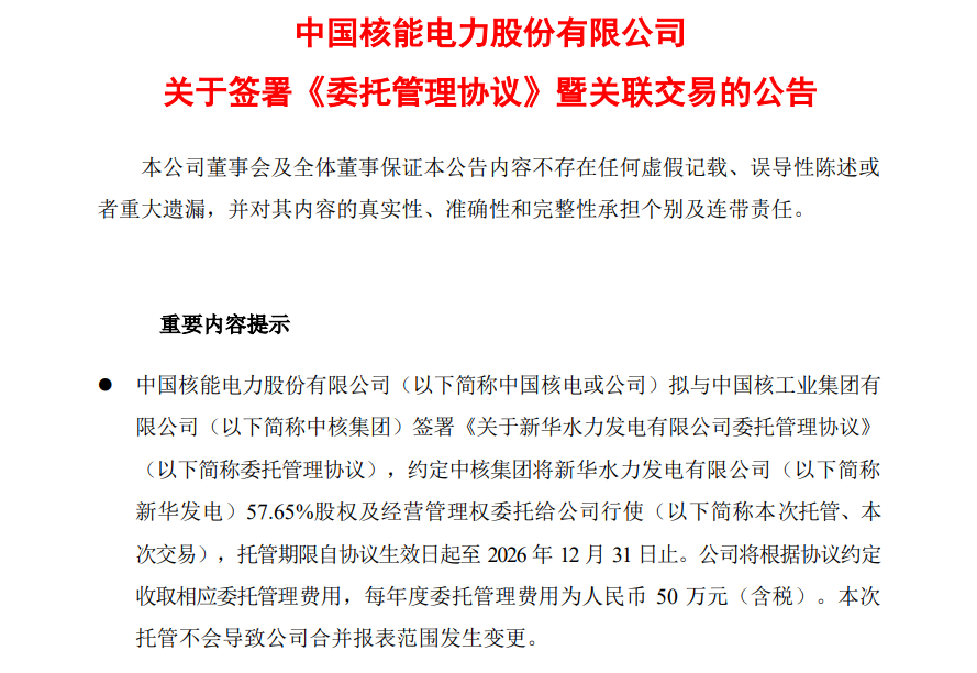 中國核電將根據(jù)協(xié)議約定收取相應(yīng)委托管理費用,每年度委托管理費用為人民幣50萬元(含稅)。本次托管不會導(dǎo)致中國核電合并報表范圍發(fā)生變更。至此,中核集團所屬的兩大非核清潔能源投資平臺——中核匯能和新華發(fā)電,正式“合體”。