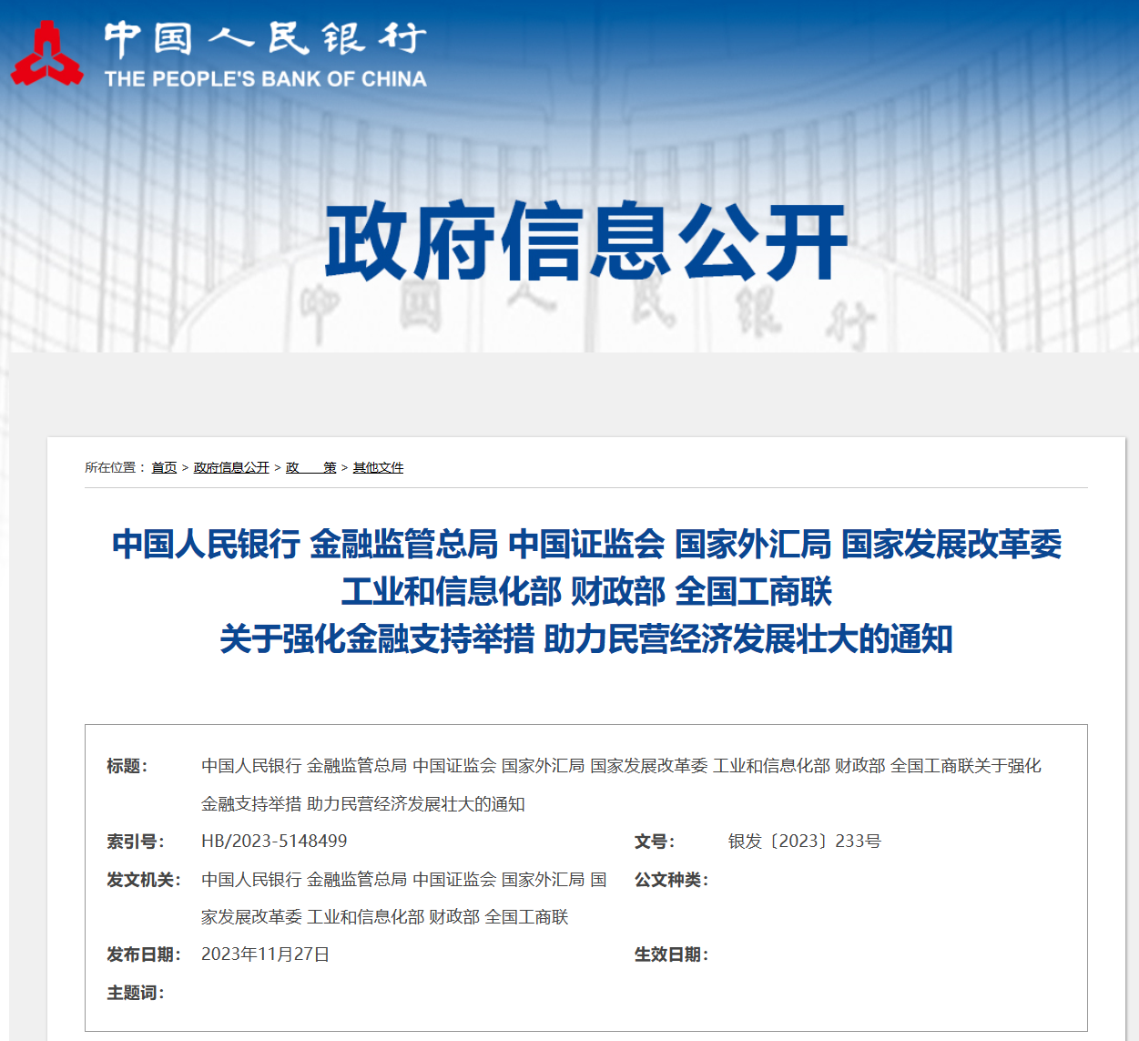 11月27日,中國(guó)人民銀行、金融監(jiān)管總局、中國(guó)證監(jiān)會(huì)、國(guó)家外匯局、國(guó)家發(fā)展改革委、工業(yè)和信息化部、財(cái)政部、全國(guó)工商聯(lián)等八部門(mén)聯(lián)合發(fā)布《關(guān)于強(qiáng)化金融支持舉措 助力民營(yíng)經(jīng)濟(jì)發(fā)展壯大的通知》,提出支持民營(yíng)經(jīng)濟(jì)的25條具體舉措。