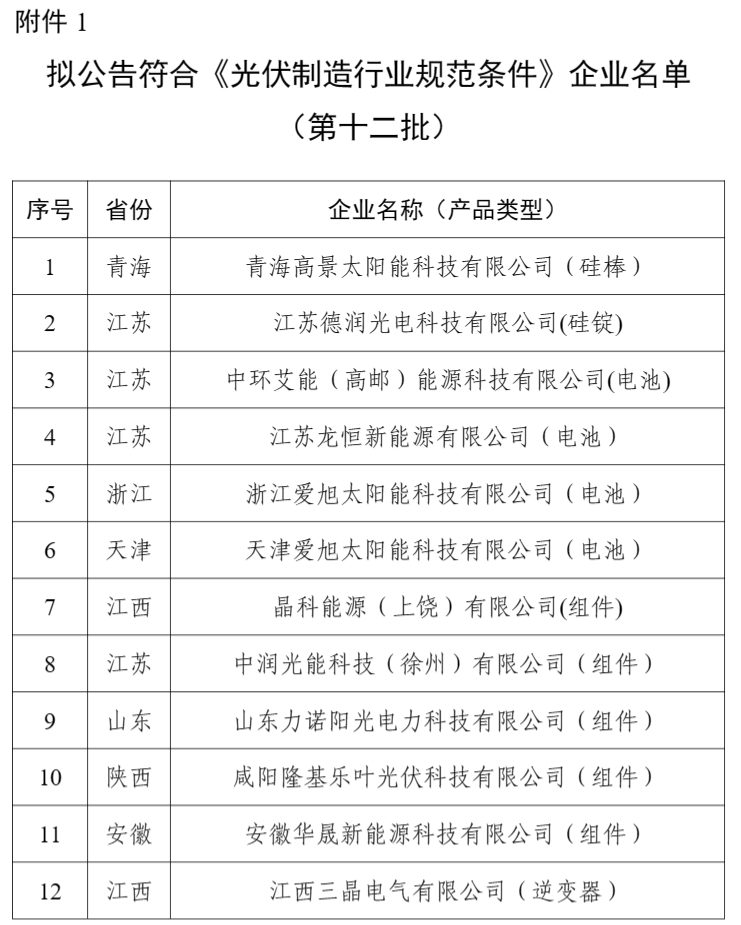 1.擬公告符合《光伏制造行業(yè)規(guī)范條件》企業(yè)名單(第十二批)