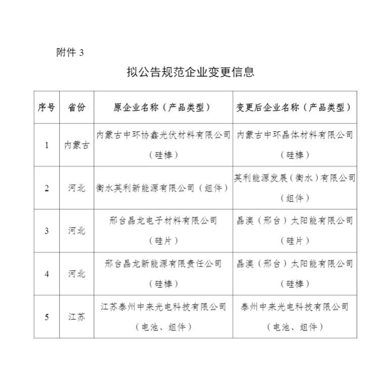 京瓷(天津)太陽(yáng)能有限公司等14家已公告企業(yè),因不能保持規(guī)范條件要求,擬撤銷其規(guī)范企業(yè)資格(見附件2);內(nèi)蒙古中環(huán)協(xié)鑫光伏材料有限公司等5家企業(yè)名稱發(fā)生變更,擬更新有關(guān)公告信息(詳見附件3),以上信息一并予以公示。