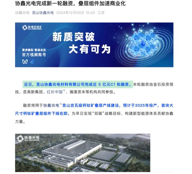 協(xié)鑫光電表示,本輪融資將用于協(xié)鑫光電昆山吉瓦級(jí)鈣鈦礦疊層產(chǎn)線建設(shè)。該產(chǎn)線預(yù)計(jì)于2025年投產(chǎn),首塊大尺寸鈣鈦礦疊層組件下線在即。