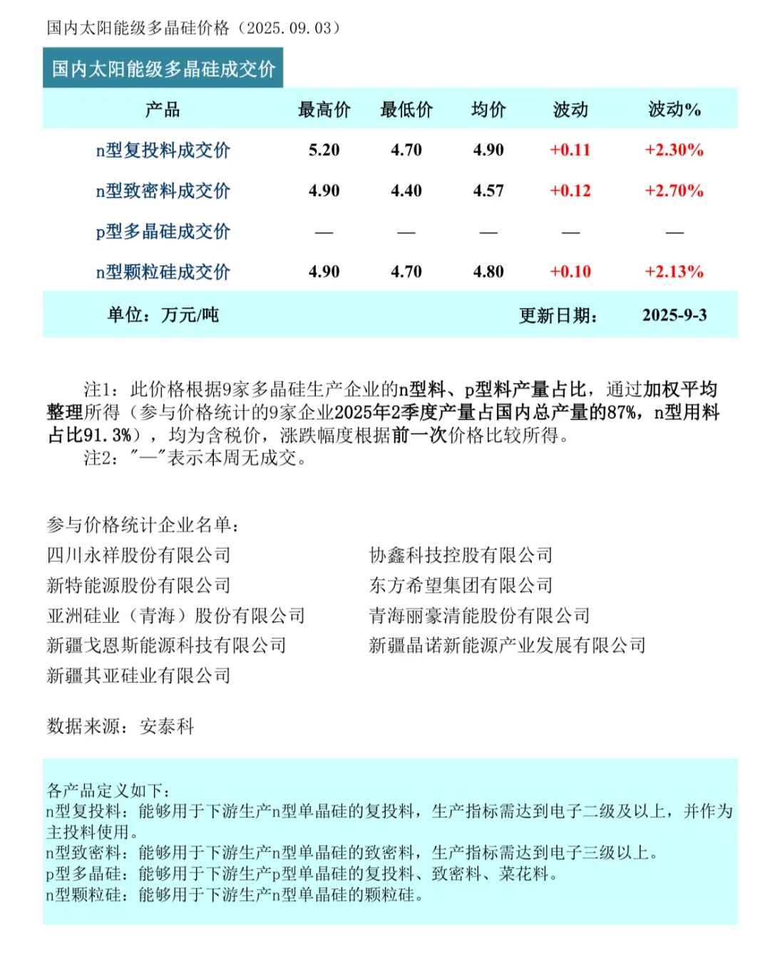 9月3日,中國有色金屬工業(yè)協(xié)會硅業(yè)分會發(fā)布本周多晶硅成交價(jià)格統(tǒng)計(jì)。n型復(fù)投料成交均價(jià)4.90萬元/噸,周環(huán)比上漲2.30%;n型致密料成交均價(jià)4.57萬元/噸,周環(huán)比上漲2.70%;n型顆粒硅成交均價(jià)4.80萬元/噸,周環(huán)比上漲2.13%。