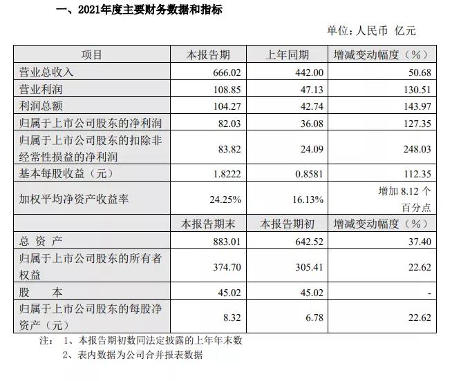 2021年末,公司總資產(chǎn)883.01億元,歸屬于上市公司股東的所有者權(quán)益374.70億元,分別較上年末增加37.4%和22.62%。