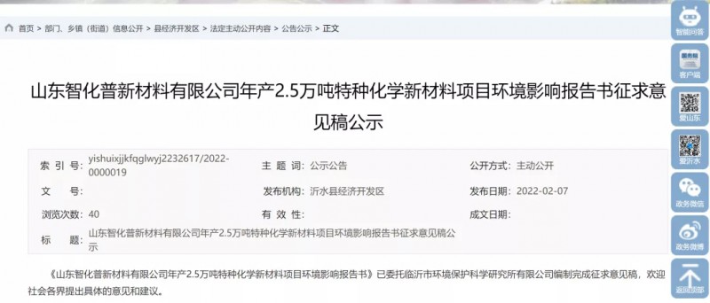 據(jù)悉,山東智化普新材料有限公司年產(chǎn)2.5萬(wàn)噸特種化學(xué)新材料項(xiàng)目目前正在進(jìn)行環(huán)評(píng)。
