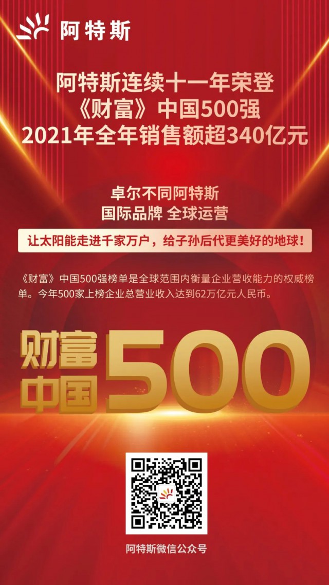 7月12日,財富中文網發(fā)布2022年《財富》中國500強排行榜,阿特斯陽光電力集團憑借2021年340億元營收再次榮登榜單。這是阿特斯集團連續(xù)第十一年上榜,充分彰顯了公司高質量可持續(xù)發(fā)展的澎湃動力。