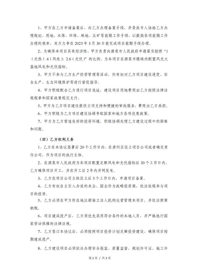 公告顯示,酒泉市肅州區(qū)人民政府在首航高科申請備案后,向首航高科辦理備案手續(xù),并委派專人協(xié)助首航高科辦理規(guī)劃、用地、水保、環(huán)保、林地、壓礦等前期工作手續(xù),以提高各項前期工作辦理的效率,雙方力爭在2023年3月30日前完成項目前期手續(xù)辦理。