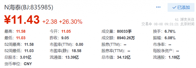 8月8日,唐山海泰新能科技股份有限公司(證券簡(jiǎn)稱:“海泰新能”,證券代碼:“835985”)正式敲鐘,登陸北京證券交易所,發(fā)行價(jià)9.05元。截至發(fā)稿,其股價(jià)達(dá)到11.43元,漲幅為26.30%,總市值超34億元。