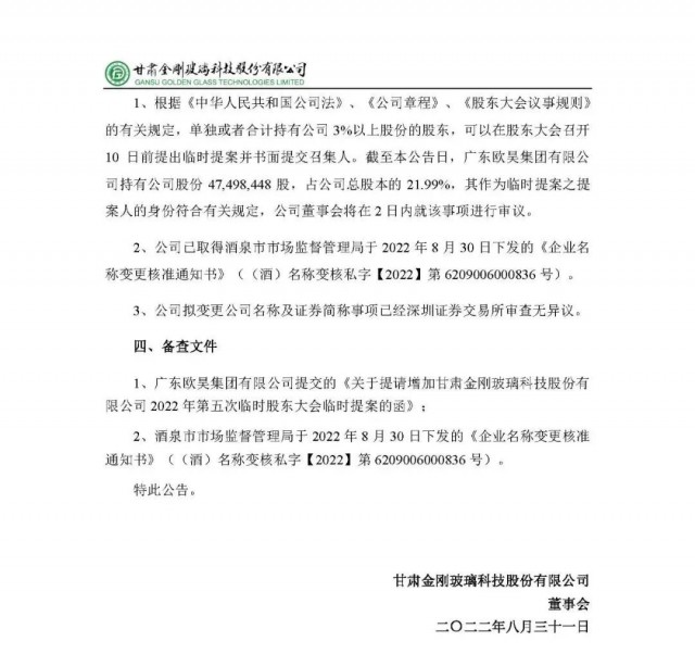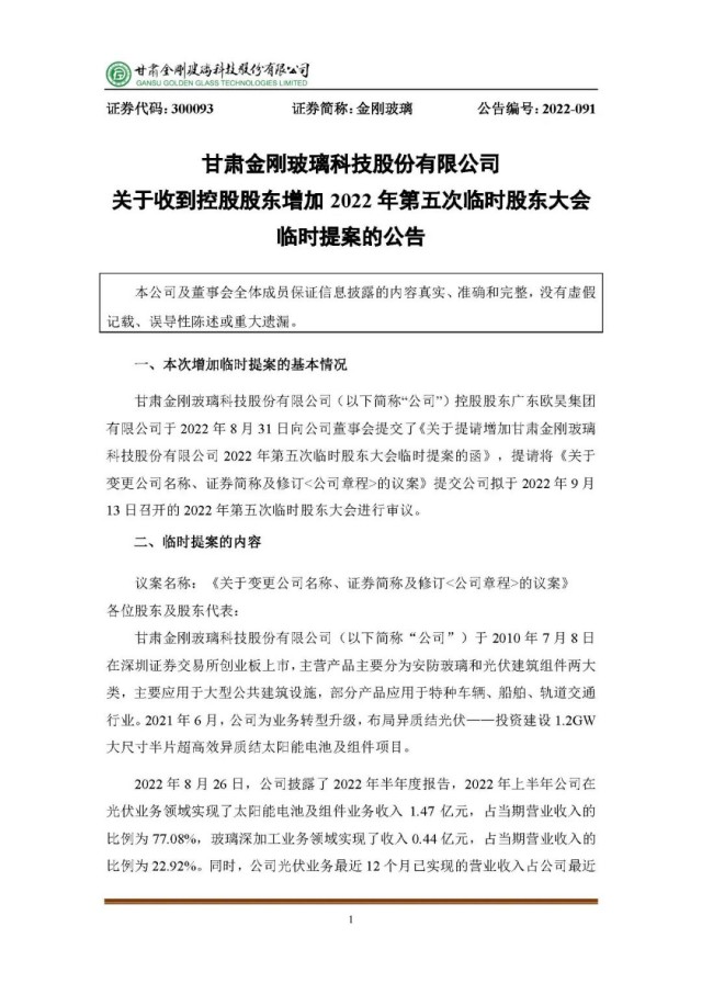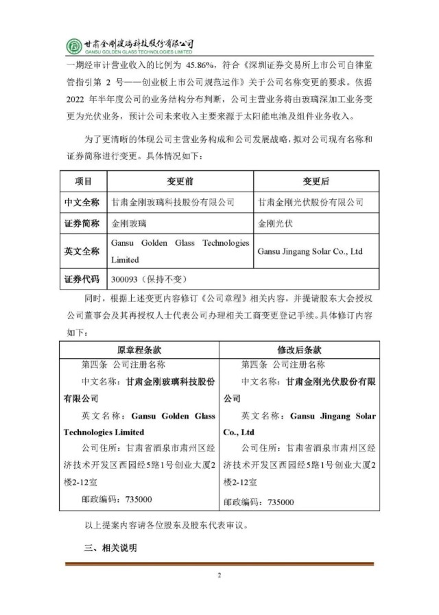 為了更清晰的體現(xiàn)公司主營業(yè)務(wù)構(gòu)成和公司發(fā)展戰(zhàn)略,擬對公司現(xiàn)有名稱和證券簡稱進(jìn)行變更。上市公司名稱由“甘肅金剛玻璃科技股份有限公司”變更為“甘肅金剛光伏股份有限公司”,證券簡稱由“金剛玻璃”改為“金剛光伏”,英文全稱由“Gansu Golden Glass Technologies Limited”改為“Gansu Jingang Solar Co., Ltd”。公司董事會將在兩日內(nèi)就該事項進(jìn)行審議。