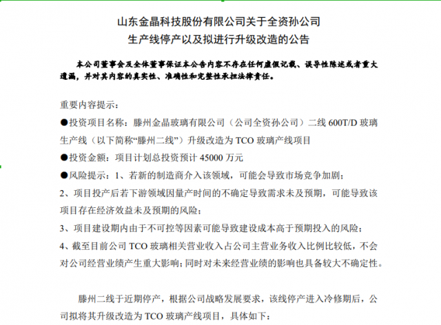 金晶科技9月12日公告,2012年9月8日滕州金晶玻璃有限公司(公司全資孫公司)二線600T/D 玻璃生產(chǎn)線(“滕州二線”)點(diǎn)火運(yùn)行,截至目前已經(jīng)達(dá)到設(shè)計(jì)窯齡,目前窯爐侵蝕狀況比較嚴(yán)重,窯爐運(yùn)行安全存在一定隱患,鑒于此,公司于近期對(duì)其停產(chǎn)。