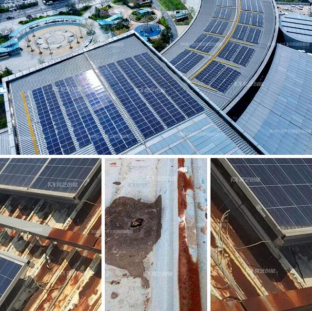 若只依靠彩鋼瓦本身的屋面,很容易因?yàn)橥繉雍穸炔粔颍又贤饩€、雨水、光合作用等自然因素的侵蝕,造成屋面彩鋼瓦接縫處開裂、鉚釘松動(dòng)生銹、屋面銹蝕擴(kuò)大、瓦脊銹蝕銹穿導(dǎo)致屋面出現(xiàn)滲水漏水的情況。同時(shí)因其坡度小,可能會(huì)造成雨水排泄不暢、積水超過彩鋼瓦接縫高度或鉚釘孔高度及溝沿瓦而導(dǎo)致銹損滲漏。而工廠生產(chǎn)過程中排放的酸性、堿性等氣體長期與屋面接觸,也會(huì)腐蝕鋼結(jié)構(gòu),加速銹蝕、穿孔導(dǎo)致滲漏。