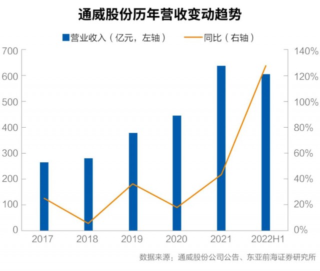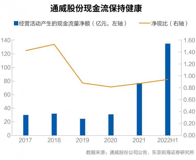 截至2022年三季度末,通威股份為全球第一大多晶硅廠商,全球市場份額近30%。另據PV Infolink數據,2022年上半年,電池片出貨排名前五分別為通威股份、愛旭股份、潤陽股份、中潤光能、捷泰科技。通威股份為第一大電池片廠商。