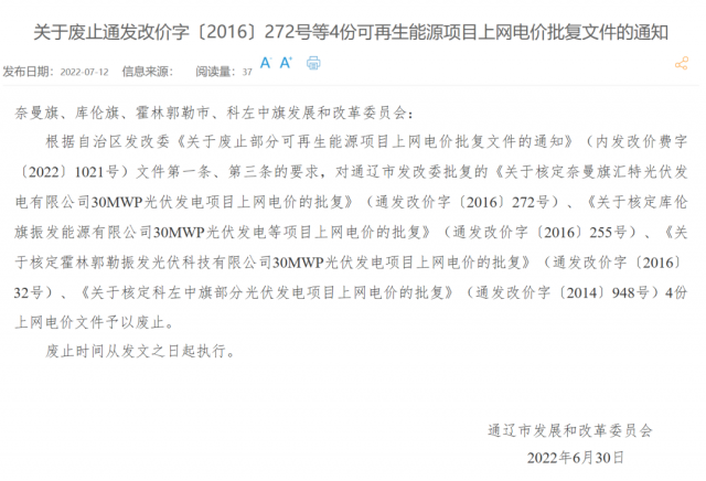 此前,太極實業(yè)(600667)8月4日晚間公告,公司關(guān)注到內(nèi)蒙古發(fā)改委官網(wǎng)刊登的《關(guān)于廢止部分可再生能源項目上網(wǎng)電價批復文件的通知》,涉及子公司五個集中式光伏電站;所涉電站將不再享受電費補貼,公司將對所涉電站評估后計提固定資產(chǎn)減值準備,初步測算固定資產(chǎn)減值金額為3.28億元左右。該項固定資產(chǎn)減值預計將減少公司2022年上半年凈利潤3.28億元左右,占最近一期經(jīng)審計凈利潤的36.12%。同時,本次電價批復廢止將導致所涉電站電價補貼被取消,經(jīng)初步測算,預計減少公司2022年下半年光伏發(fā)電業(yè)務(wù)收入4906萬元左右,減少公司2022年下半年凈利潤4170萬元左右。