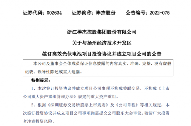 棒杰股份表示結合自身戰(zhàn)略轉型優(yōu)勢及我國光伏產(chǎn)業(yè)快速發(fā)展的機遇,依托戰(zhàn)略股東 光伏領域的豐富經(jīng)驗和揚州經(jīng)濟技術開發(fā)區(qū)管委會體制創(chuàng)新、發(fā)展活力及產(chǎn)業(yè)政 策支持,投資建設10GW高效光伏電池片生產(chǎn)基地,實現(xiàn)公司主營業(yè)務向光伏業(yè)的戰(zhàn)略轉型升級,形成新的利潤增長點,為公司業(yè)務發(fā)展提供有力支持,是公司實施戰(zhàn)略發(fā)展的重要舉措,對公司未來發(fā)展具有積極意義和推動作用。