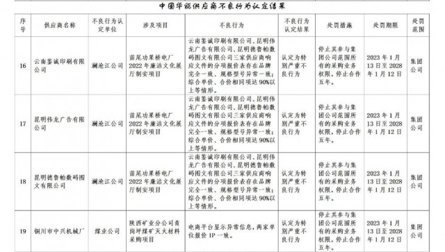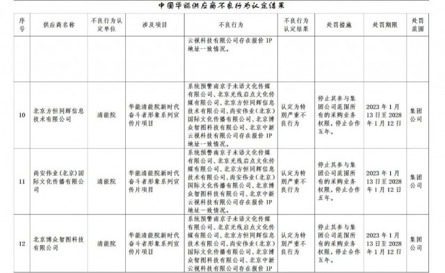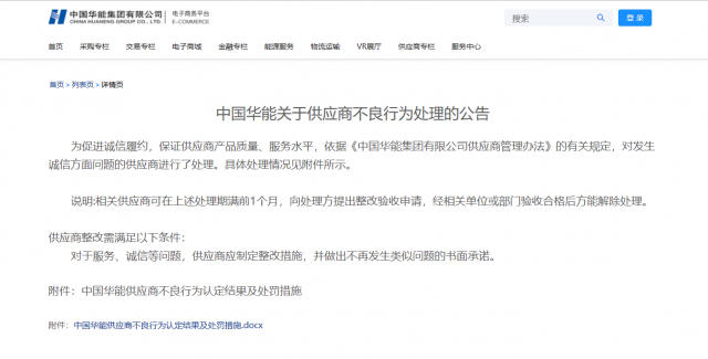 公告稱:為促進(jìn)誠(chéng)信履約,保證供應(yīng)商產(chǎn)品質(zhì)量、服務(wù)水平,依據(jù)《中國(guó)華能集團(tuán)有限公司供應(yīng)商管理辦法》的有關(guān)規(guī)定,對(duì)發(fā)生誠(chéng)信方面問題的供應(yīng)商進(jìn)行了處理。