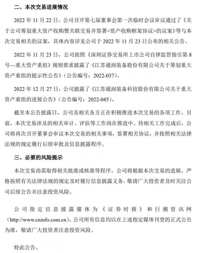 2022年12月27日,公司披露了《江蘇通潤裝備科技股份有限公司關(guān)于重大資產(chǎn)重組的進(jìn)展公告》。截至本公告披露日,公司及相關(guān)各方正在積極推進(jìn)本次交易的各項(xiàng)工作。目前,本次交易涉及的相關(guān)審計(jì)、評估等工作尚在推進(jìn)中。待相關(guān)工作完成后,公司將再次召開董事會審議本次交易的相關(guān)事項(xiàng),簽署相關(guān)協(xié)議,并按照相關(guān)法律法規(guī)的規(guī)定履行后續(xù)審批及信息披露程序。