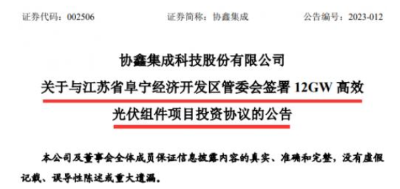 2月15日,協(xié)鑫集成發(fā)布公告稱,該公司擬在江蘇省阜寧經濟開發(fā)區(qū)投資建設12GW高效光伏組件項目。