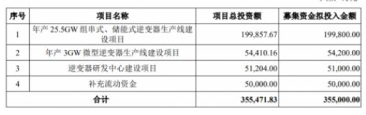 本次定增擬募集資金總額不超過35.5億元,扣除發(fā)行費(fèi)用后,將用于年產(chǎn)25.5GW組串式、儲(chǔ)能式逆變器生產(chǎn)線建設(shè)項(xiàng)目;年產(chǎn)3GW微型逆變器生產(chǎn)線建設(shè)項(xiàng)目;逆變器研發(fā)中心建設(shè)項(xiàng)目和補(bǔ)充流動(dòng)資金。